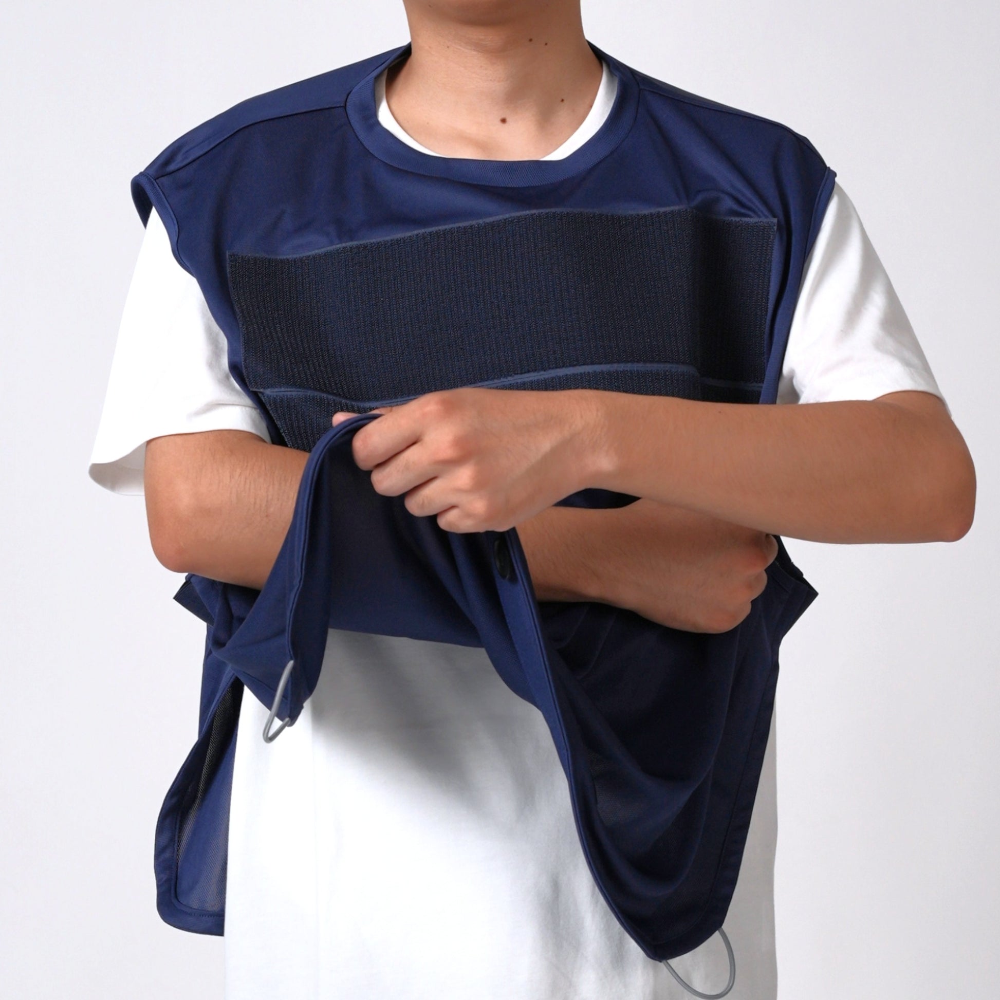 アームスリングと一体化したシャツ。片手の小さな動作で簡単に着脱ができ、面ファスナーで前腕の高さを調整できます。肘は患側のループを引っ張り中央のボタンに留めることで固定します。通気性と速乾性が高い素材なので一年を通して着られます。