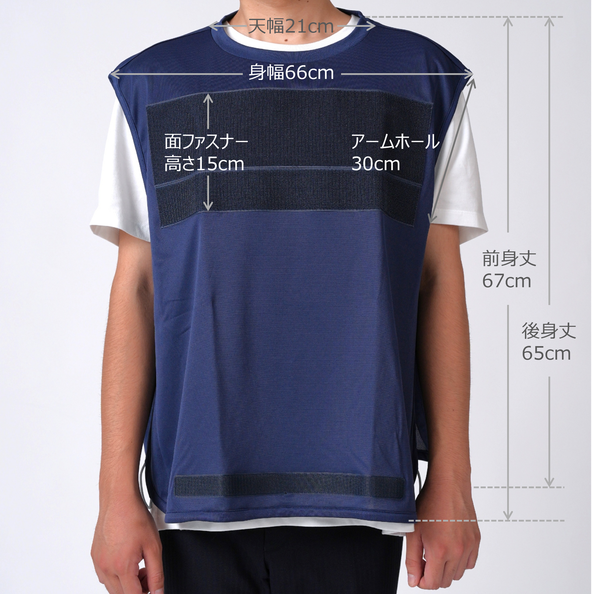 前身丈67cm・後身丈65cm・身幅66cm・肩幅50cm・アームホール30cm・天幅21cm