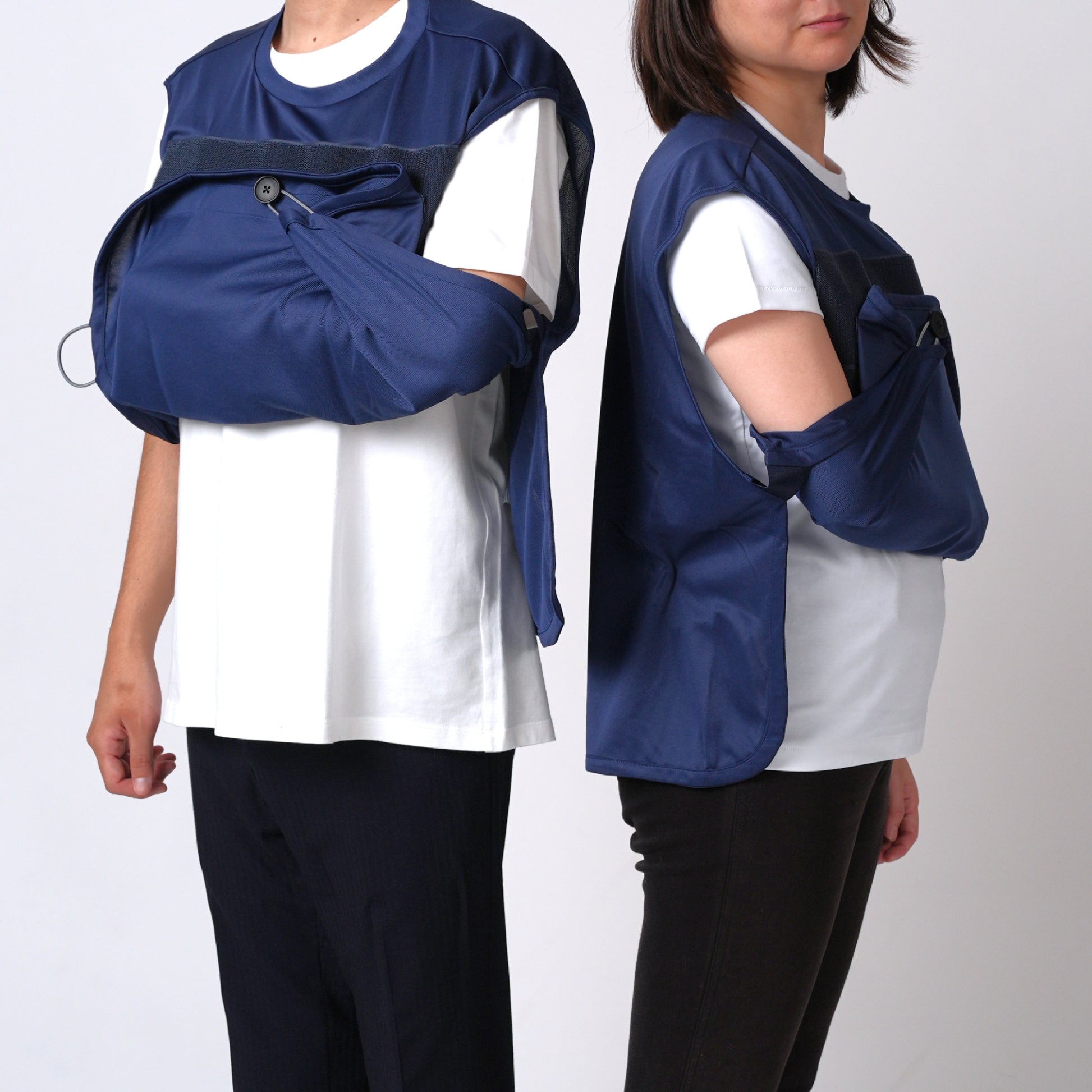 アームスリング(三角巾)と一体化した服。面ファスナーで形成される外袋に腕をゆだね、病院や施設、ご自宅内外で安心して生活を送れます。補助具をポジティブな日常着として装うことでリハビリを前向きな気持ちで取り組めます。片手で簡単に着脱、腕の保持/非保持の切り替え可能。通気性が良いので季節を問わず着られ上からも服を羽織れます。
